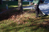 Człowiek z dmuchawy liści spadł jesienią liście w stoczni turbiny wiatrowej