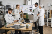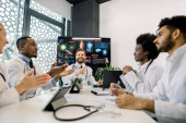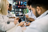 Zespół pięciu różnych wielonarodowych lekarzy odbywających wideokonferencję w szpitalu, rozmawiających ze swoimi dwoma młodymi afrykańskimi i kaukaskimi kolegami, analizujących tomografię komputerową, sposoby leczenia i diagnostyki