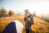 Młody turysta stawia namiot w górach. Facet rozbija obóz na wycieczce, zbiera namiot sam w górach o zachodzie słońca.