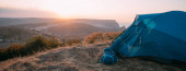 Młody turysta stawia namiot w górach. Facet rozbija obóz na wycieczce, zbiera namiot sam w górach o zachodzie słońca.