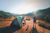 Zdjęcie "Młody turysta stawia namiot w górach. Facet rozbija obóz na wycieczce, zbiera namiot sam w górach o zachodzie słońca." może być wykorzystywane do celów osobistych i komercyjnych zgodnie z warunkami zakupionej licencji Royalty-free. Obraz jest dostępny do pobrania w jakości wysokiej rozdzielczości do 5760x3840.