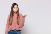 ładna kobieta czuje się zakłopotana i zdezorientowana, drapiąc się po głowie i patrząc w bok
