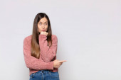 Zdjęcie "ładna kobieta czuje się szczęśliwy, podekscytowany i zaskoczony, patrząc na bok z obu rąk na twarzy" może być wykorzystywane do celów osobistych i komercyjnych zgodnie z warunkami zakupionej licencji Royalty-free. Obraz jest dostępny do pobrania w jakości wysokiej rozdzielczości do 5760x3840.