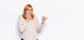 ruda głowa ładna kobieta uczucie w miłości i patrząc słodkie, uroczy i szczęśliwy, uśmiechnięty romantycznie z rąk obok twarzy