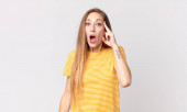 ruda głowa ładna kobieta wyglądająca zdumiewająco z niedowierzaniem, wskazując na obiekt na boku i mówiąc wow, niewiarygodne