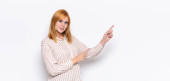 ruda głowa ładna kobieta czuje się jak geniusz trzymając palec dumnie w górze po uświadomieniu sobie świetny pomysł, mówiąc eureka