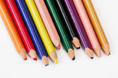 Kredki - kolorowy ołówek, Ołówki kolorowe, Zbliżenie makro strzał z ołówka stos kolorystyczny łyżki ołówka, używane ołówki z sali sztuki szkoły. szkoła stacjonarna, powrót do szkoły
