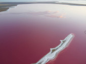 Widok z lotu ptaka na różowe jeziora solne, piaszczyste i słone brzegi wzdłuż przylądka.