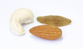Połączenie orzechów nerkowca, orzechów migdałowych i rodzynek, zdrowych przekąsek mieszanych orzechów i suszonych owoców.