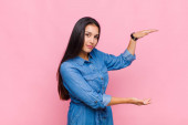 Zdjęcie "młoda ładna kobieta uśmiecha się radośnie i wskazując na skopiowanie miejsca na dłoni z boku, pokazując lub reklamując obiekt" może być wykorzystywane do celów osobistych i komercyjnych zgodnie z warunkami zakupionej licencji Royalty-free. Obraz jest dostępny do pobrania w jakości wysokiej rozdzielczości do 5760x3840.