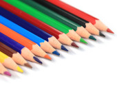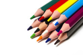 Kredki - kolorowy ołówek, Ołówki kolorowe, Zbliżenie makro strzał z ołówka stos kolorystyczny łyżki ołówka, używane ołówki z sali sztuki szkoły. szkoła stacjonarna, powrót do szkoły