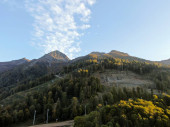 Widok z lotu ptaka panoramiczny krajobraz gór o zachodzie słońca na tle błękitnego nieba. Piękny zachód słońca w górach