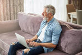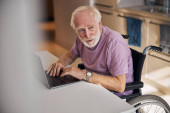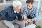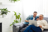Uśmiechnięty emeryt z laptopem patrzący na młodego mężczyznę