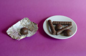 Ciasteczka i papierowa torba na czarnym stole. Pyszne słodycze z dżemem owocowym wyciek z opakowania papieru. Wyroby cukiernicze.