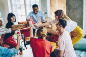 Zdjęcie "Portret wesołej białej kobiety uśmiechniętej do kamery podczas pozytywnego spotkania z najlepszymi przyjaciółmi, szczęśliwych milenijnych hipsterów śmiejących się podczas imprezy pokerowej z piwem w mieszkaniu na poddaszu" może być wykorzystywane do celów osobistych i komercyjnych zgodnie z warunkami zakupionej licencji Royalty-free. Obraz jest dostępny do pobrania w jakości wysokiej rozdzielczości do 5760x3840.