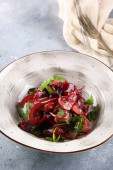Zdjęcie "Kuchnia orientalna. Bakłażan Bishtak. Bakłażan z grilla z serem feta, pomidorami, oliwą z oliwek, czosnkiem, ziołami w beżowym talerzu ze szklanką czerwonego wina na szarym stole. Obraz tła, przestrzeń do kopiowania" może być wykorzystywane do celów osobistych i komercyjnych zgodnie z warunkami zakupionej licencji Royalty-free. Obraz jest dostępny do pobrania w jakości wysokiej rozdzielczości do 5760x3840.