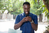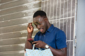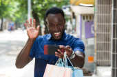 Zdjęcie "młody człowiek stojący przy ścianie po zakupach patrząc na telefon komórkowy z uśmiechem." może być wykorzystywane do celów osobistych i komercyjnych zgodnie z warunkami zakupionej licencji Royalty-free. Obraz jest dostępny do pobrania w jakości wysokiej rozdzielczości do 5760x3840.