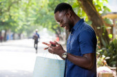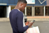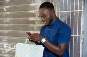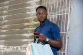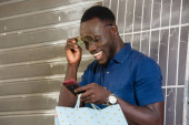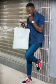 młody człowiek stojący przy ścianie po zakupach patrząc na telefon komórkowy z uśmiechem.