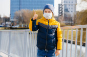 Zdjęcie "Chłopiec stoi na szarym tle w masce podczas kwarantanny z wolną przestrzenią. Kwarantanna w masce" może być wykorzystywane do celów osobistych i komercyjnych zgodnie z warunkami zakupionej licencji Royalty-free. Obraz jest dostępny do pobrania w jakości wysokiej rozdzielczości do 5760x3840.