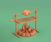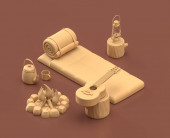Izometryczne pieczenie kurczaka przy ognisku. monochromatyczny żółty sprzęt kempingowy na brązowym tle, renderowanie 3D, polowanie i camping
