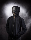 Młody mężczyzna w masce medycznej w bluzie na czarnym tle
