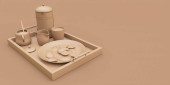 Izometryczna puszka tuńczyka, obiekty kempingowe i sceny, monochromatyczny żółty sprzęt kempingowy na zielonym tle, renderowanie 3D, polowanie i kemping