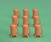Trzy żółte plastikowe stołówki na zielonym tle, monochromatyczne pojedyncze płaskie kolory, renderowanie 3d