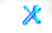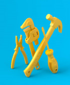 Młotek izometryczny i piła tylna na niebieskim tle, warsztat jednokolorowy i narzędzie DIY, renderowanie 3d