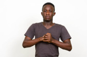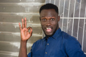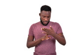 młody człowiek w niebieskiej koszuli siedzi na zewnątrz myśląc palcami na ustach.