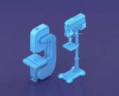 Izometryczna szlifierka taśmowa i piła taśmowa na niebieskim tle, jednokolorowy warsztat i narzędzie DIY, renderowanie 3D