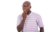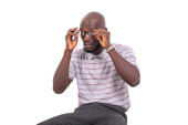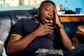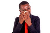 młody człowiek w niebieskiej koszuli siedzi na zewnątrz myśląc o dłoniach na policzkach.