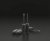 Ciemnoszare wiadro farby, miotła i wałek farby na czarnym tle, warsztat jednego koloru i DIY narzędzia, renderowania 3d