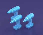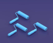 Izometryczne wiadro farby, miotła i wałek do malowania na niebieskim tle, warsztat jednokolorowy i narzędzie DIY, renderowanie 3D
