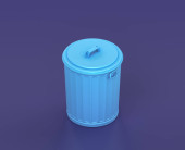 Izometryczny kosz na śmieci, wiadro do czyszczenia i miotła na niebieskim tle, warsztat jednokolorowy i narzędzie DIY, renderowanie 3D