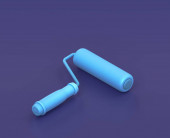 Izometryczne wiadro farby, miotła i wałek do malowania na niebieskim tle, warsztat jednokolorowy i narzędzie DIY, renderowanie 3D