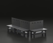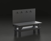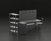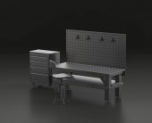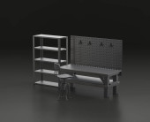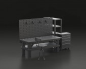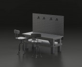 Ciemnoszary warsztat jednokolorowy z warsztatem warsztatowym w niebieskim tle, warsztat naprawy płaskich kolorów, renderowanie 3d