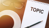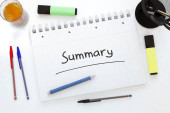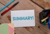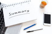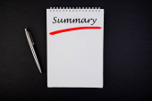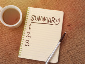Notatnik z kawą na drewnianym stole i notatki o podsumowaniu