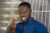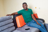 młody człowiek siedzi na zewnątrz i patrzy w kamerę.
