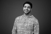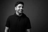młody przystojny brodaty indyjski człowiek na szarym tle