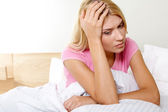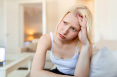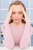 sfrustrowany młoda kobieta, trzymając głowę w ręce i wyrażania negatywnych