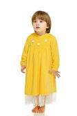 Słodka dziewczynka w żółtej sukience, odizolowana na biało. 2 lata.