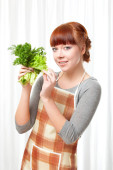 uśmiechnięta młoda gospodyni mieszania świeże sałatki