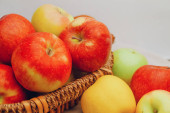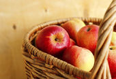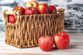 Kosz z jabłkami na drewnianym stole, przestrzeń do kopiowania.