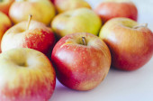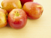 Czerwone i żółte jabłka na drewnianym stole. Zdrowa żywność