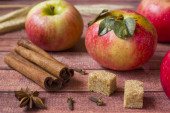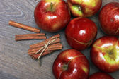 Czerwone jabłka i cynamonowe patyki na drewnianym stole. Zdrowa żywność