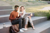 Zdjęcie "Dwóch współczesnych współpracowników międzykulturowych z mobilnymi gadżetami siedzącymi na drewnianej ławce w parku przeciwko nowoczesnej architekturze" może być wykorzystywane do celów osobistych i komercyjnych zgodnie z warunkami zakupionej licencji Royalty-free. Obraz jest dostępny do pobrania w jakości wysokiej rozdzielczości do 5760x3840.