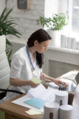 Młody blond klinicysta w białym płaszczu przegląda medyczne dane online stojąc między biurkiem z monitorem komputerowym a oknem