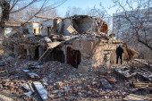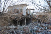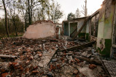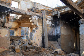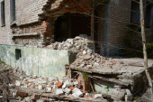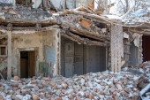 demontaż starego budynku, zawalonego od kataklizmu lub starości, budynku bez ściany i dachu z rozklekotanym drugim piętrem, cegieł i śmieci.