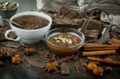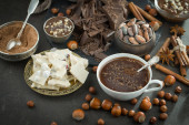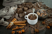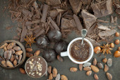 Ciemna czekolada w kompozycji z ziarnem kakaowym i orzechami, na starym tle.