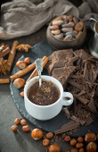 Ciemna czekolada w kompozycji z ziarnem kakaowym i orzechami, na starym tle.